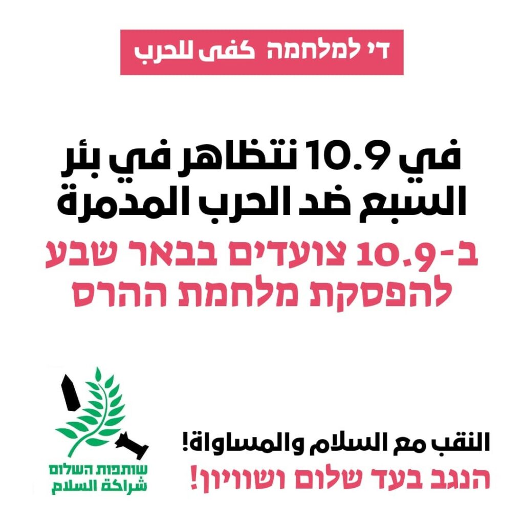 הנגב בעד שלום ושוויון!. אם לא כל הנגב, אז לפחות חלק ממנו. ביום שלישי ה -10.9 קראו ארגונים שונים להפגין בבאר שבע, לצעדה נגד המלחמה, למען עסקה שתחזיר את כולם הביתה ולמען השלום. ההפגנה תצא בשעה 19:00 ממרכז המורים ותצעד למשכן אמנויות הבמה, שם תתקיים עצרת תחת הכותרת “הנגב בעד שלום ושוויון”.