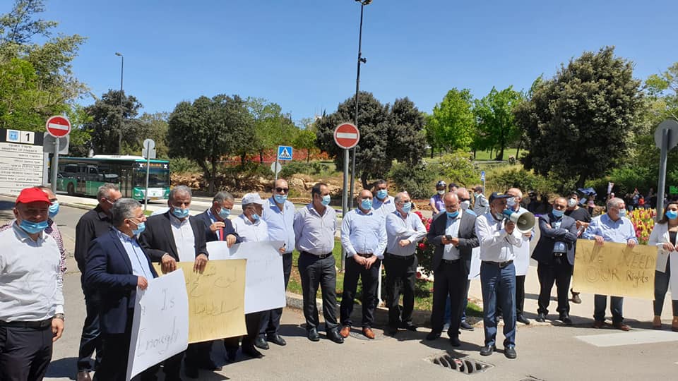 الصورة من مظاهرة رؤساء السلطات المحلية العربية امام وزارة المالية والكنيست.