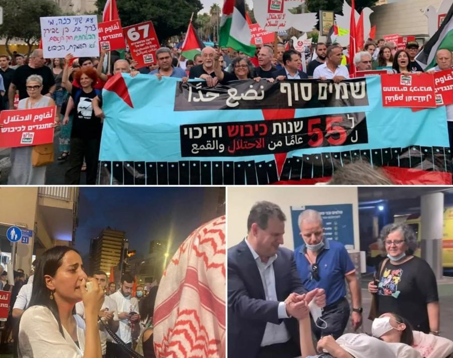 وقد شارك في المظاهرة التي نظمت السبت بدعوة من الحزب الشيوعي والجبهة قادة القائمة المشتركة النواب أيمن عودة وعايدة توما سليمان، النائب السابق دوف حنين، والنائب السابق عصام مخول، وأعضاء الكنيست من ميرتس موسي راز وجابي لاسكي. كما وانضم اليهم آلاف الناشطين ضد الاحتلال من حركات: محاربون للسلام، نكسر الصمت، نقف سويًا، نساء ضد العنف، السلام الآن، حاخامات لأجل حقوق الانسان، ننظر للاحتلال بالعينين، محسوم ووتش، ميسارفوت، زازيم، ومجموعات أخرى. وقد رفع المتظاهرون رايات حمراء وأعلام فلسطين وعلم محكمة الجنايات الدولية في لاهاي. وهتفوا ضد الاحتلال قائلين “يهود وعرب يرفضون ان يكونوا أعداء”، و “مسافر يطا لا تقلقي سنوقف التهجير”، وغيرها من الهتافات ضد “حكومة التغيير”.
