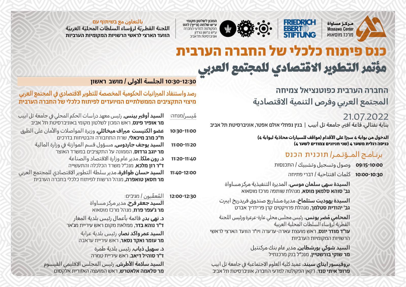 يعقد غدا الخميس 21.7.2022 مؤتمر التطوير الاقتصادي للمجتمع العربي بمبادرة مركز مساواة مؤسسة فردريخ ابرت معهد الحكم المحلي في جامعة تل ابيب بالتعاون مع اللجنة القطرية لرؤساء السلطات المحلية العربية.