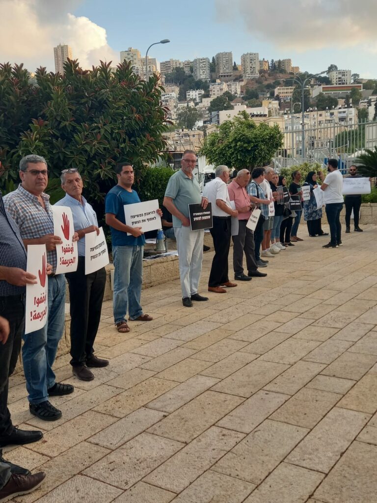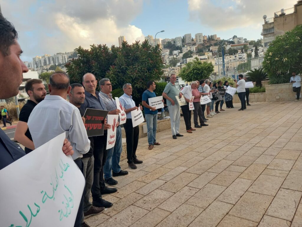 ونظمت أمس الثلاثاء مظاهرة شبيهة أمام مقر شرطة لواء حيفا بمدينة حيفا، شارك بها العشرات أيضًا.