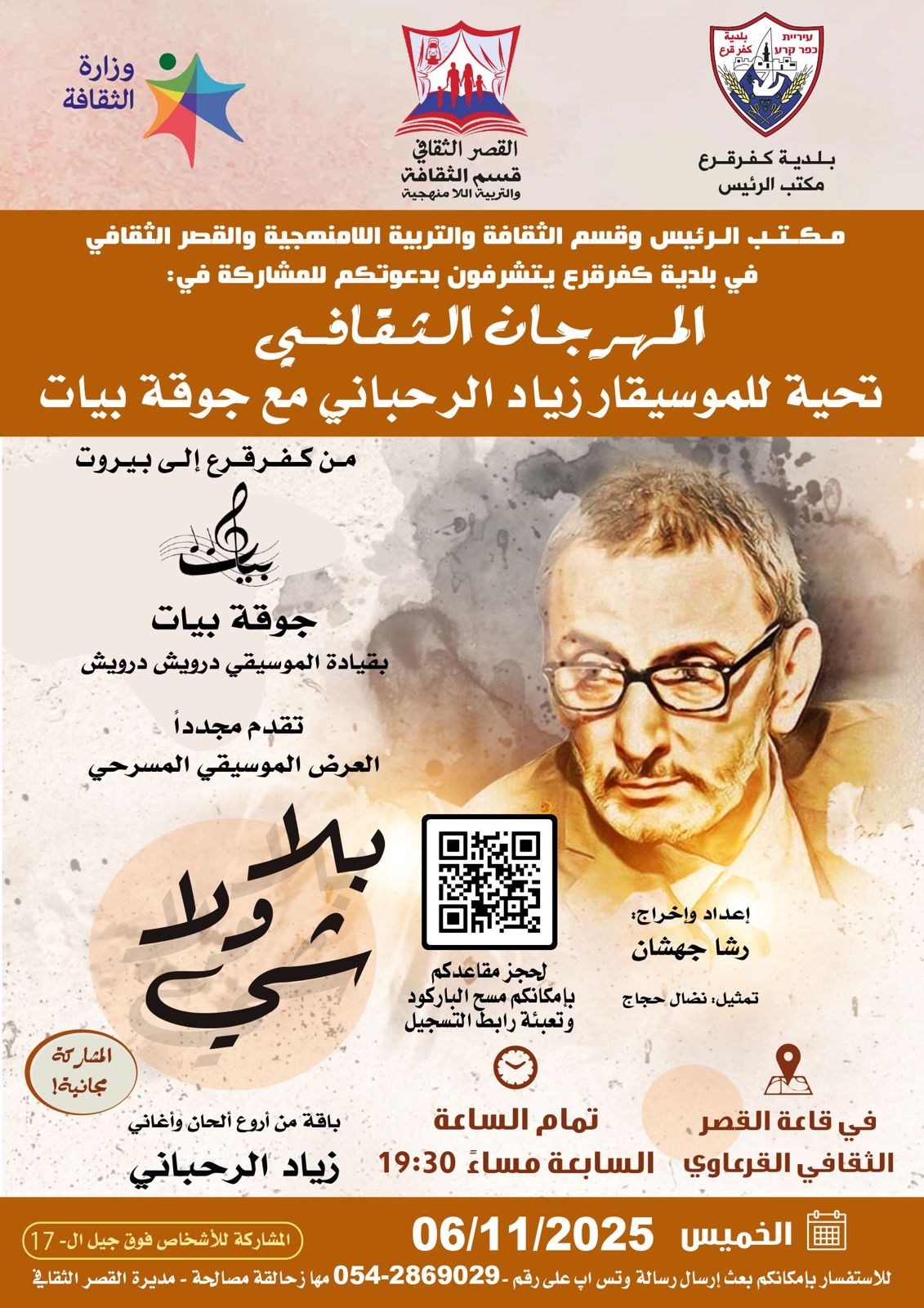 6 ноября в Дворце культуры Кафр-Кары состоится особый вечер под названием «Между всем и ничем». Музыкально-драматическое представление с участием хора «Байят» под руководством маэстро Дарвиша Дарвиша.